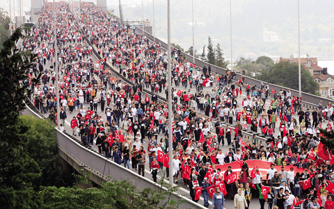 10月28日,数万人在土耳其最大城市伊斯坦布尔横跨欧亚两洲的博斯普鲁斯海峡大桥上跑步。