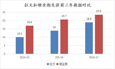 当然,虽然扣篮给拉文带来了名气,但是此时拉文的队内地位仍然没有状元维金斯高,从拉文和维金斯职业生涯前三年的数据来看,两人的比较毫无疑问是维金斯占据上风,而且维金斯虽然没有参加过扣篮大赛,但是他的身体素质并不比拉文差,所以当时的情况下,状元秀和13号秀的差距